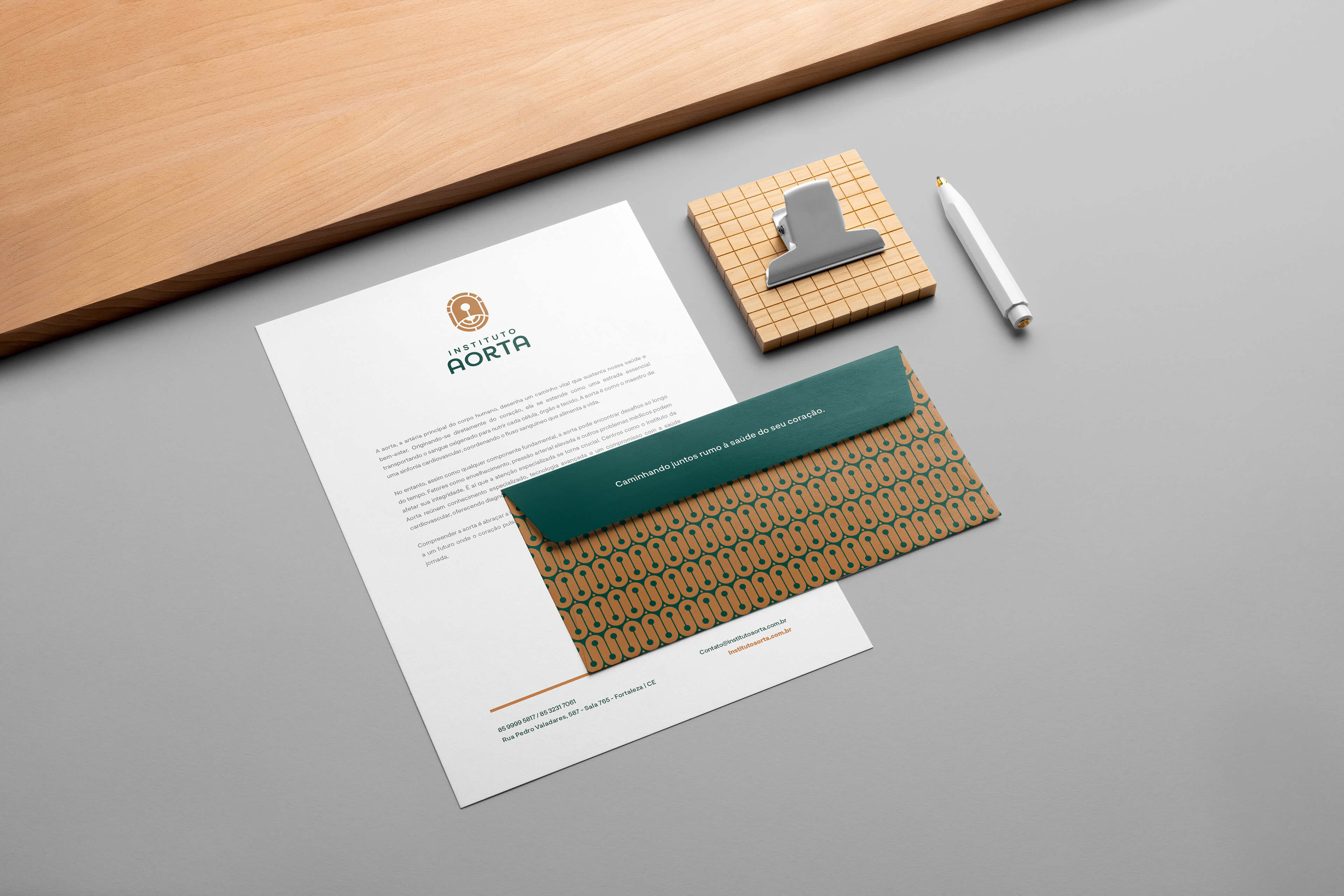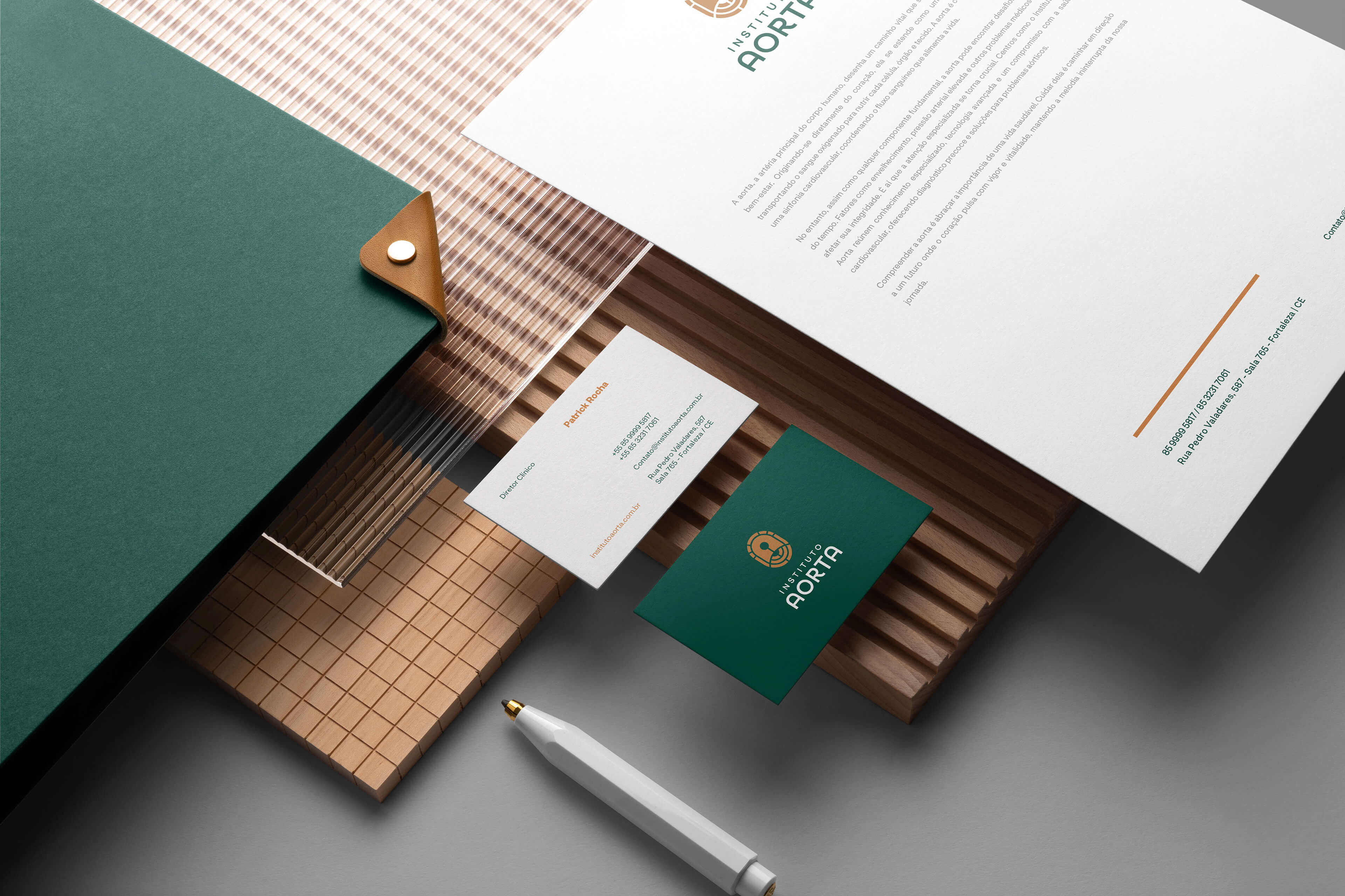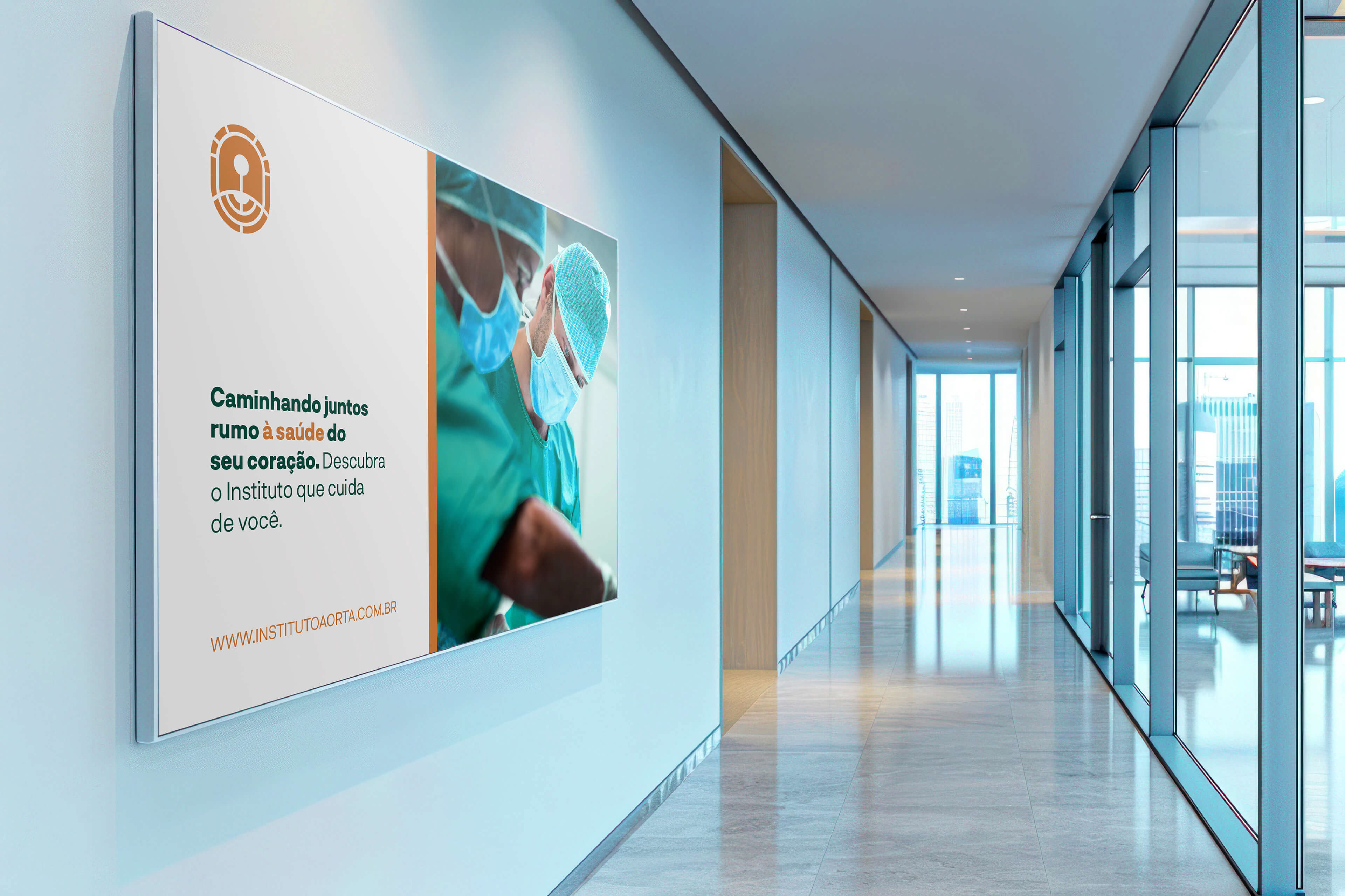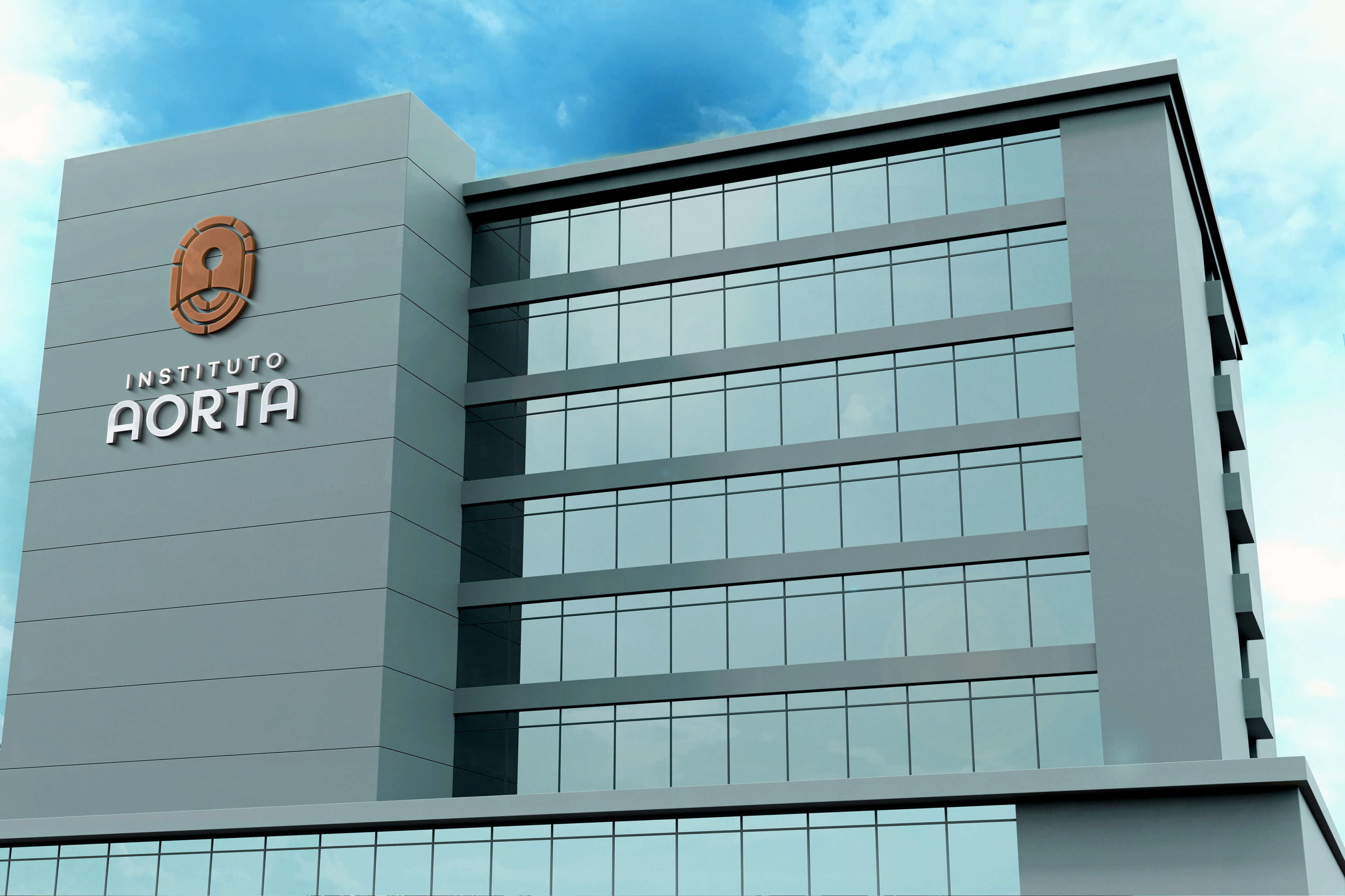 A identidade do Instituto Aorta nasce do compromisso em unir alta tecnologia médica, humanidade e excelência no cuidado vascular. O logotipo foi construído a partir de uma síntese visual que combina ciência e simbolismo, representando tanto a inicial da marca quanto o fluxo vital da aorta e de seus ramos. A forma orgânica e segmentada do isotipo remete ao sistema circulatório, transmitindo movimento e continuidade, enquanto reforça a ideia de cuidado especializado para os acessos de hemodiálise e o tratamento de aneurismas.
